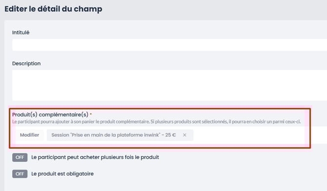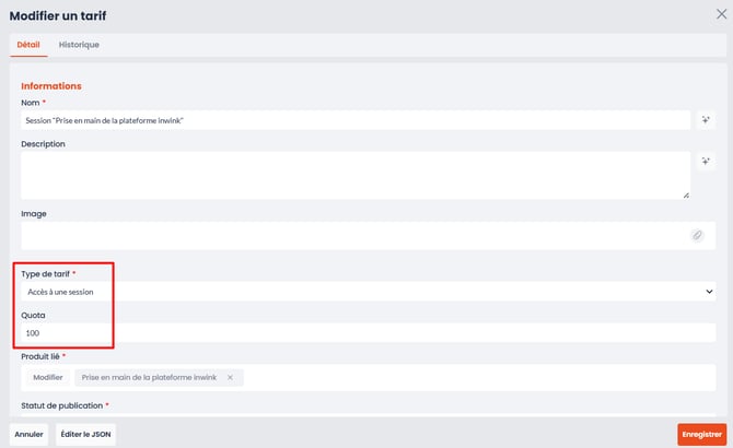 • Le produit lié (ici, la session à rattacher au tarif, afin qu'elle soit payante)