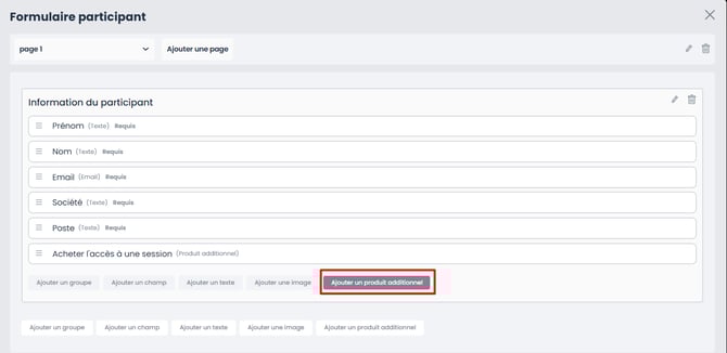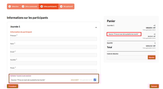 Pour être proposé à la vente, le tarif "Accès à une session" doit être ajouté dans l'affichage des produits additionnels de la billetterie et apparaît uniquement à l’étape Informations participant (troisième étape de votre billetterie).