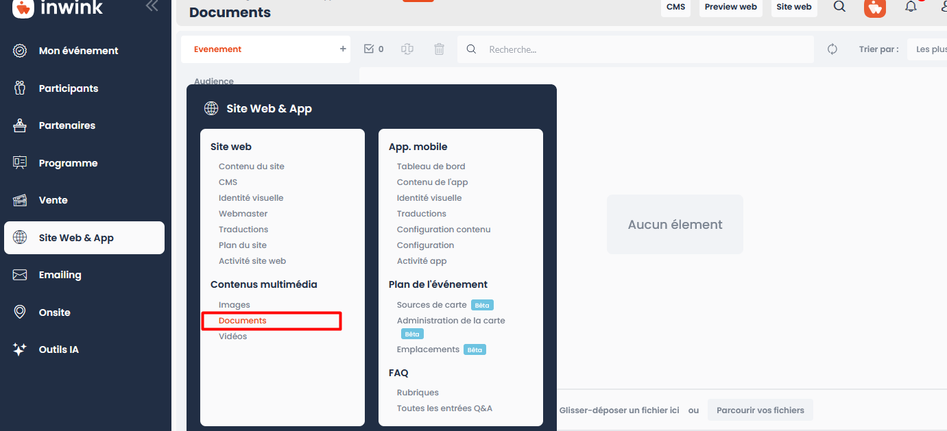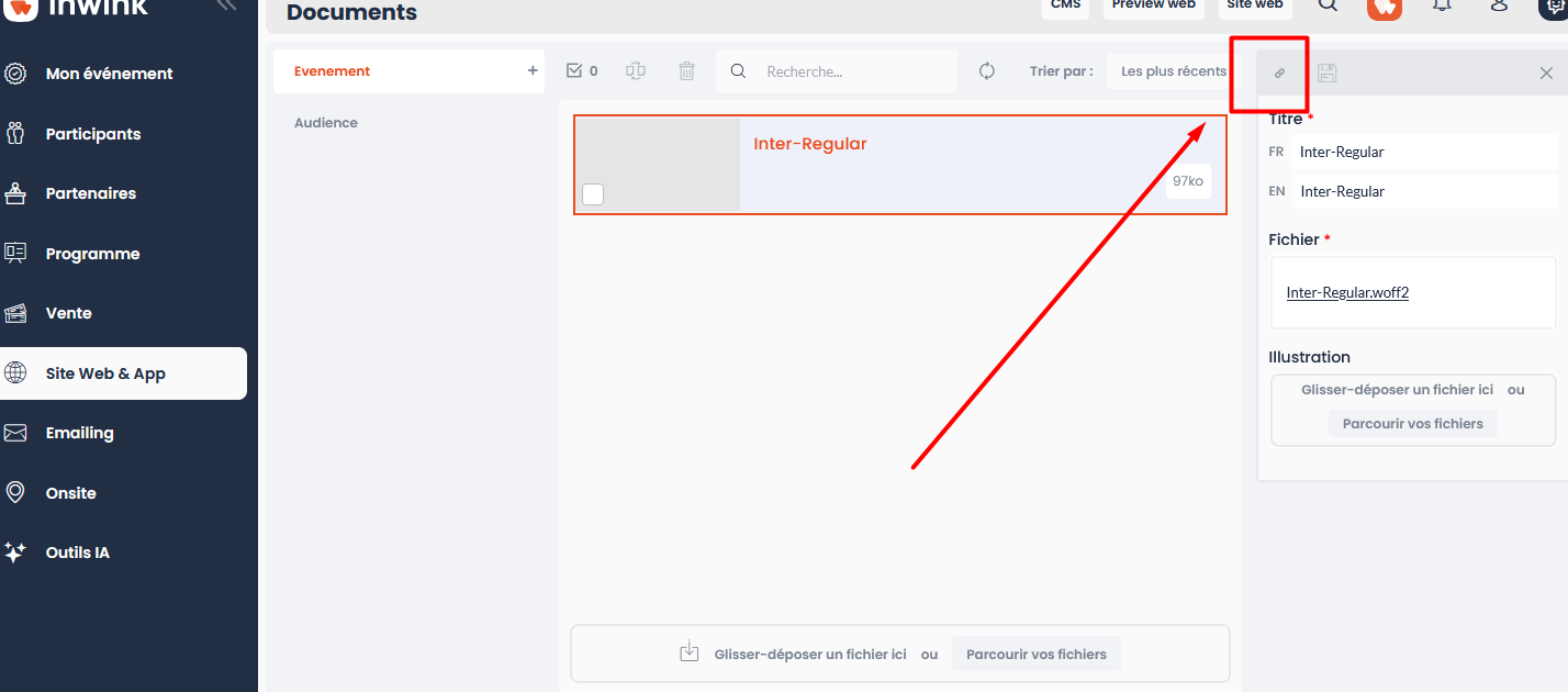 - Rendez-vous dans le back-office inwink de l'événement/communauté > Site web > Contenu Multimedia > Documents puis charger un à un les fichiers de votre police extraits de Transfonter (fichiers au format .woff2)