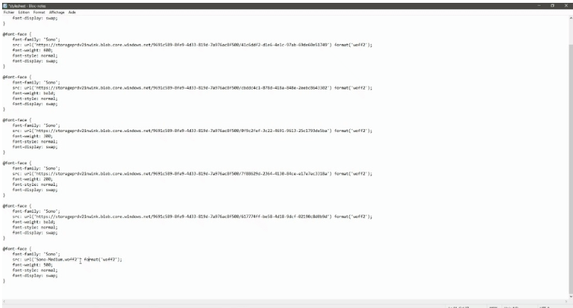 - Ouvrez le fichier "stylesheet" extrait de Transfonter. Dans ce fichier, vous retrouverez un paragraphe par graisse de police (regular, bold, etc.)