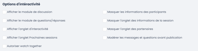 - Afficher l'onglet d'interactivité : cochez cette case si vous souhaitez que la session comporte des sondages (oui/non, choix unique, choix multiple), que vous pouvez planifier dans le Back-Office ou directement dans la session en tant qu'orateur, ou si vous souhaitez ajouter un bouton d'action pour renvoyer vers une autre page.
