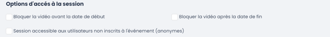 - Session accessible aux utilisateurs non inscrits à l'évènement (anonymes) : en cochant cette case, vous permettez aux personnes non inscrites et non connectées à votre évènement (et à la session) de visionner celle-ci