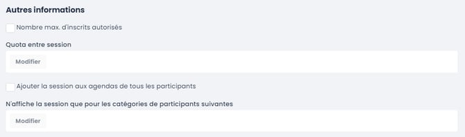 - Ajouter la session aux agendas de tous les participants (comme les plénières, par exemple) : cochez cette case pour ajouter la session à l'agenda personnel de tous les participants