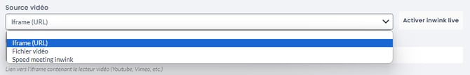 Dans le cas d'une "Session en ligne", en plus des éléments ci-dessus, vous devez choisir d'utiliser un contenu vidéo ou d'activer un live inwink :