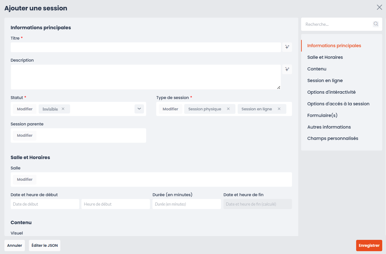 - Salle : sélectionnez la salle qui sera reliée à la session.