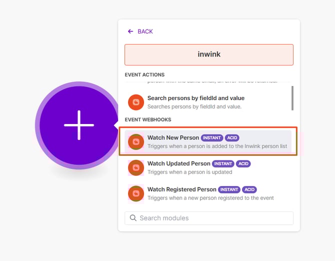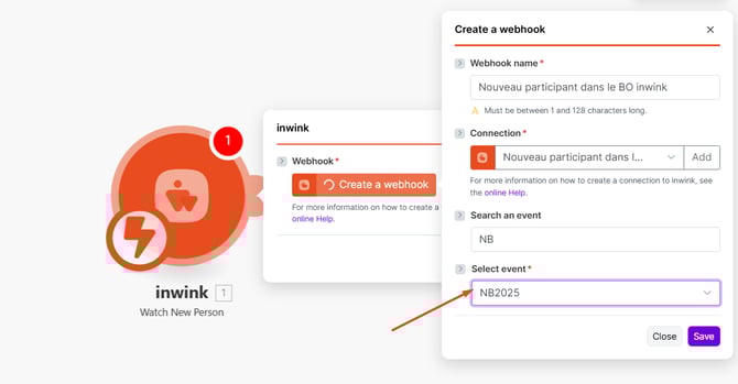 • Tous les webhooks créés côté Make apparaissent automatiquement dans le back-office inwink :