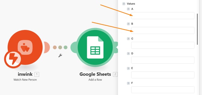 Associez les champs inwink aux colonnes de l’outil externe en remplissant les colonnes A, B, C, etc.