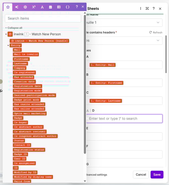• Mapping : correspondance entre les champs de données Inwink et ceux de l’outil externe (ex. Google Sheets, CRM).