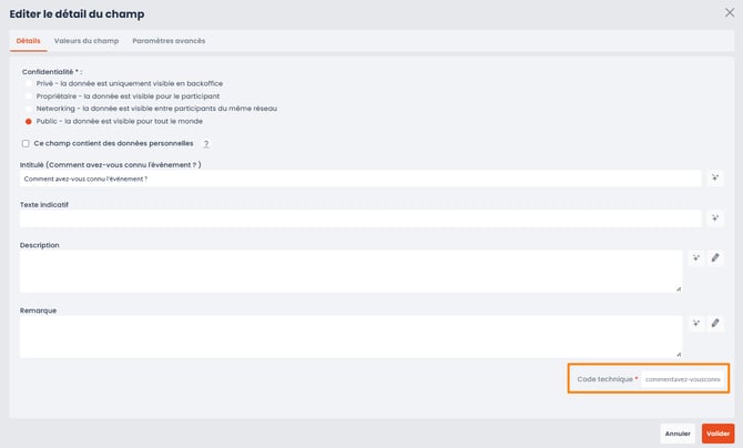 1. Récupérez le code technique du champ souhaité dans inwink :