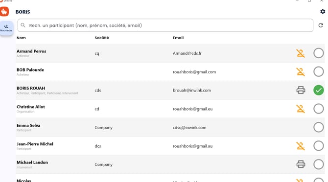 Les critères de recherche s'appliquent sur : le prénom, le nom, l'entreprise et l'email du participant.