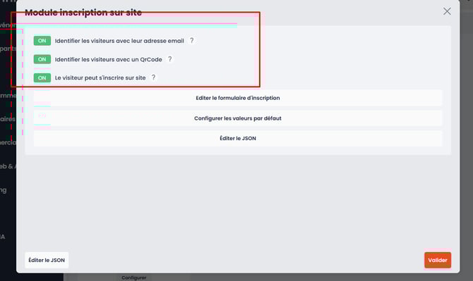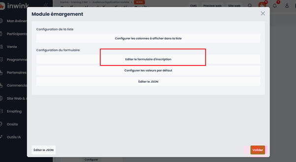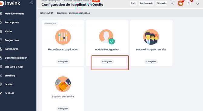 Pour ajouter l'auto-émargement sur votre événement, vous devez activer le module "Inscription sur site" en back-office (inwink onsite > Configuration)