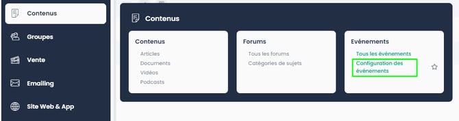 Afin de permettre à un membre modérateur de créer des événements, il faut au préalable que ceux-ci aient été ajoutés à la configuration dans le back-office.