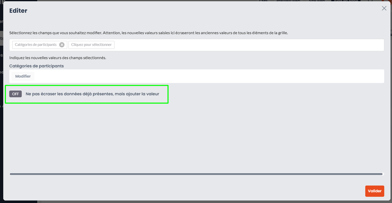 Une option "Ne pas écraser les données déjà présentes, mais ajouter la valeur" peut être présente en fonction de certains champs que vous souhaitez modifier en masse, par exemple "Catégorie de participants" :