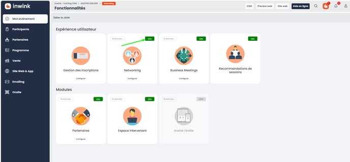 - It is necessary to activate the networking functionnality in your inwink back end (menu My event > Modules):