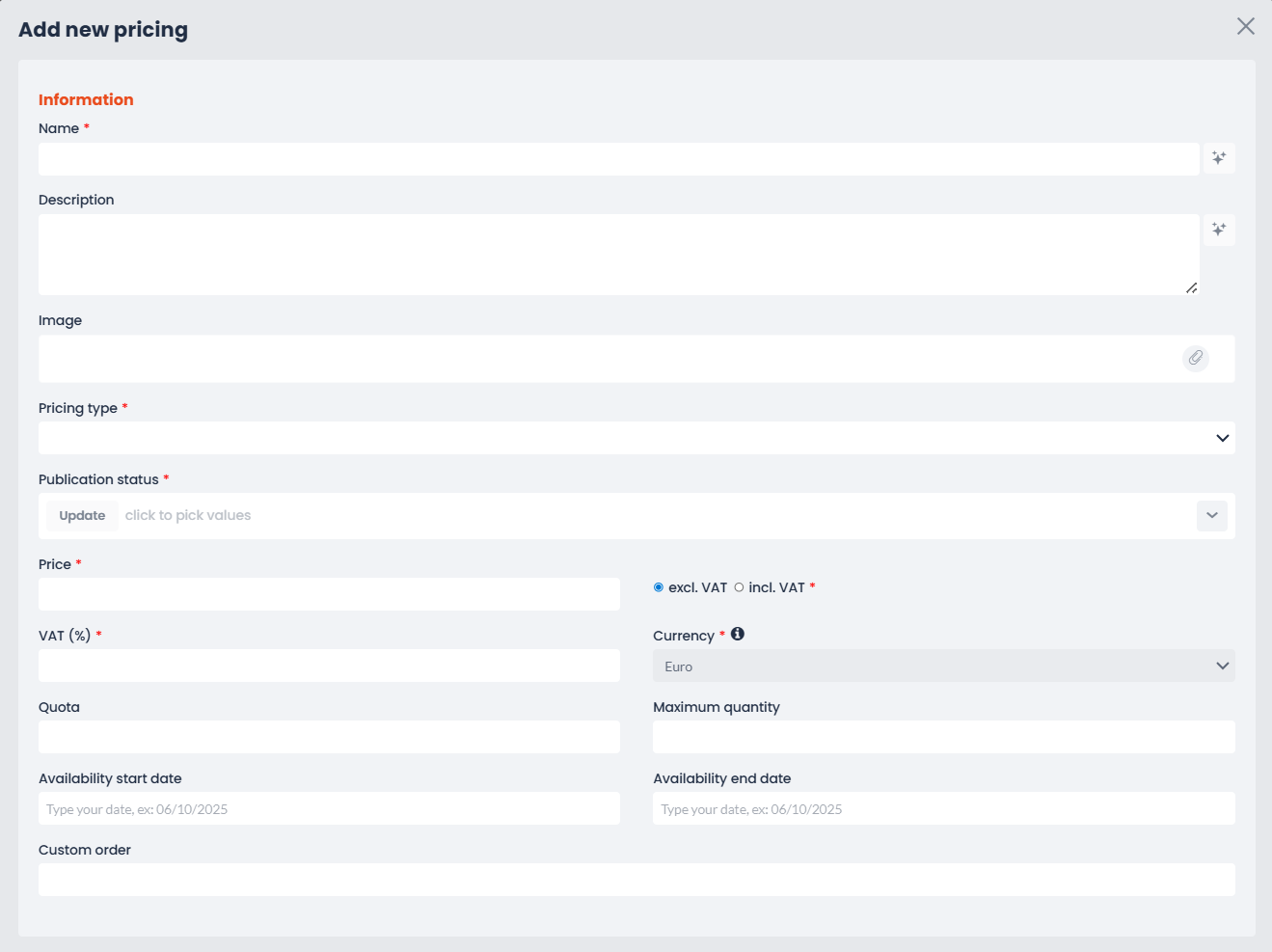👉 The "Published" status is required to display the price on the website. - Price excl. VAT: The price including VAT will be calculated automatically